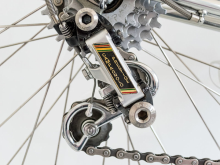 Ein Highlight französischer Rahmenbaukunst von Jean Paul Routens aus dem Jahre 1980. Er ist der Sohn des weiltberühmten Jo Routens aus Grenoble. Jean Paul übernahme das Atelier im Dezember 1975, sein Vater war auch weiterhin dort anzutreffen. Der Rahmen weist alle Insignien von Jo Routens auf -- wenige Details wurden von Jean Paul modifiziert wie beispielsweise die Sattelklemmung oder die Ausfallenden von Shiman Dura Ace. Der Kommentar von Jean Paul zum Velo: "super achat". Ein Klick auf die Fotografie leitet zur Bildergalerie und zusätzlichen Infos.
