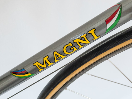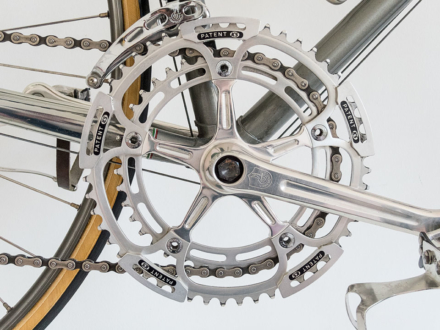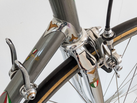 Als Fan von Jacques Mercet's Werken freue ich mich, dieses frühe Exemplar seines Schaffens aus dem Jahre 1968 vorzustellen. Der oder die Besitzer haben es wertgeschätzt und Komponenten mit Upgrades ausgetauscht. So sind der Campagnolo Nuovo Record Wechsel, die Shimano Dura Ace Bremsen und Griffe, die FT Bologna Radnaben und die Super Champion Record du Monde Felgen zu Lebzeiten von Mercet nach und nach dazugekommen. Mir oblag es, diese Tradition weiter zu führen und NOS Bremsgriffgummis von Shimano, ein NOS Benotto Celotape Lenkerband, NOS Christophe Pedalriemen in passender Farbe zu montieren und ein Satz neue Collés neu aufzukleben.